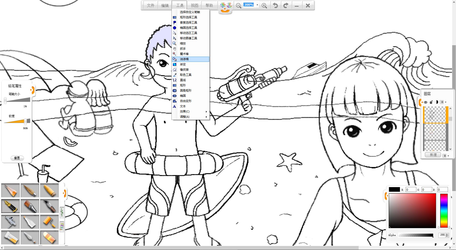 8.打開工具菜單。使用魔術棒工具選定閉合區域后,用油漆桶工具為人物鋪上底色。