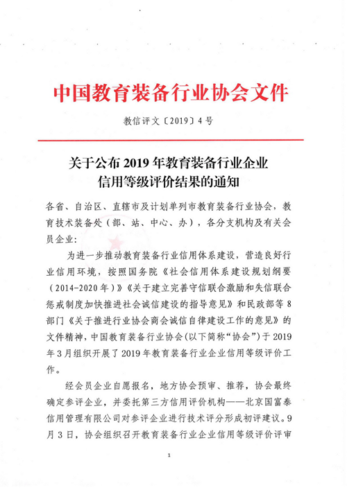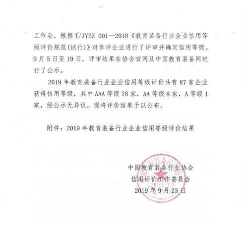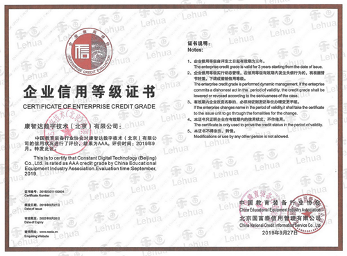 康智達公司榮獲中國教育裝備行業協會企業信用等級評價AAA級證書