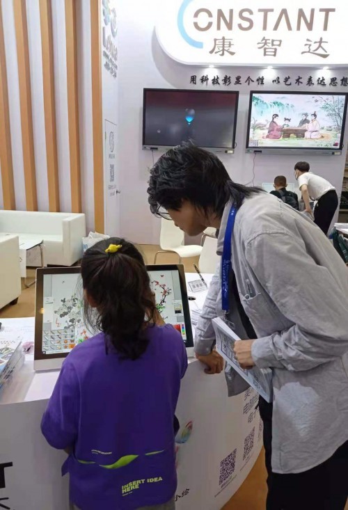 展館內(nèi)一家參展商的可愛小女兒成了展會期間三天中每天的“忠粉”,全天候選擇各種繪畫板、繪畫屏和繪畫一體機(jī)輪番涂鴉,甚是興高采烈