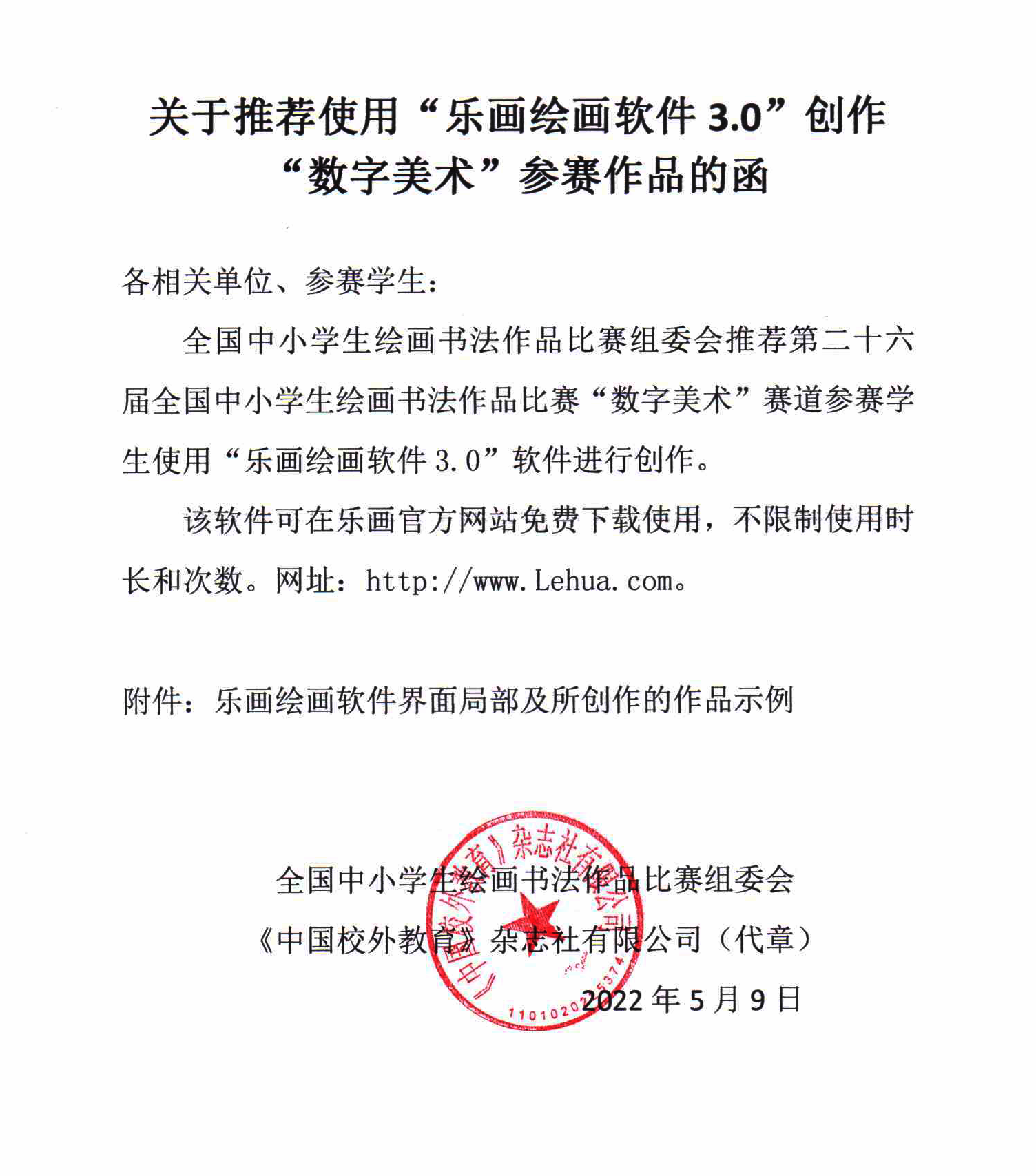 全國中小學生繪畫書法作品比賽組委會推薦第二十六屆全國中小學生繪畫書法作品比賽“數(shù)字美術”賽道參賽學生使用“樂畫繪畫軟件3.0”軟件進行創(chuàng)作。