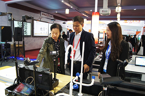 陜西省教育廳教育技術裝備管理中心主任趙夢(左)蒞臨廣視通展位參觀指導