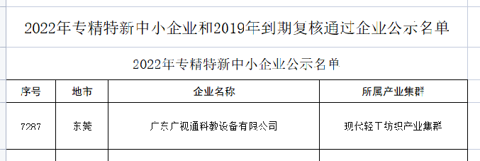 近日,廣東省工業和信息化廳發布了《關于2022年“專精特新”中小企業和2019年到期復核通過企業名單的公示》,廣視通成功入選,順利通過了2022年廣東省“專精特新”中小企業認定。