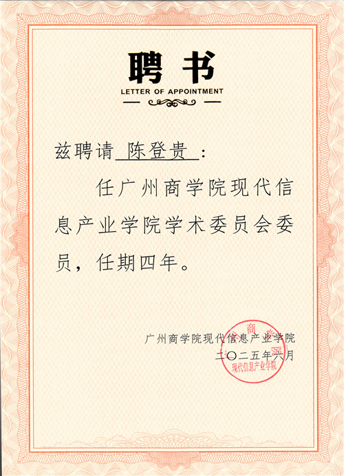 學(xué)術(shù)委員會委員聘任儀式,我司董事長陳登貴先生受聘為廣州商學(xué)院現(xiàn)代信息產(chǎn)業(yè)學(xué)院學(xué)術(shù)委員會委員。