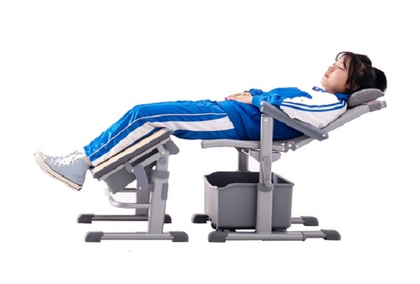 6、課桌椅午休模式:課桌通過兩側按鍵調節到最低高度,并將桌面向前下方折疊固定,課椅靠背向后調節,借助桌上和椅下空間,可在1米前后間距實現150度原位舒適躺休。