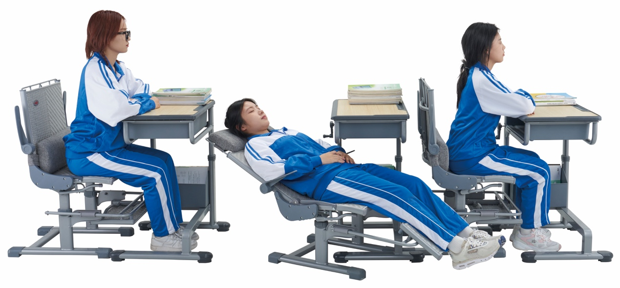 產品在研發時充分考慮到教室空間的利用率,將課椅椅腳進行延長保證穩固性,午休時將課椅向前移動,將桌面搖高到午休高度,充分利用課桌下方的可用空間和前位椅下的空間,并且讓平躺午休更加舒適安全。
