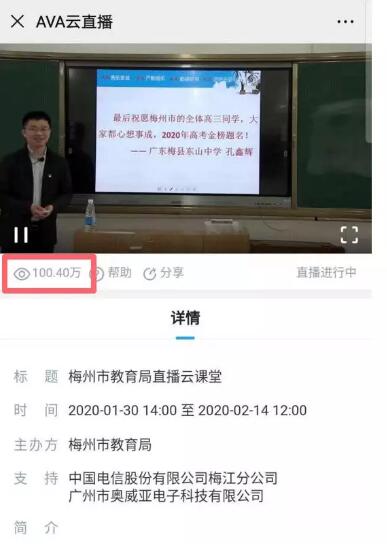 2月2日,為滿足高三學生的備考需要,廣東梅州市教育局組織開展“名師備考輔導網絡直播活動”,通過奧威亞的錄播設備及“名師直播支持服務”,向全市高三學生直播。一天內,東山中學共直播四節課,涵蓋語文、數學、英語、物理。上午2節直播課結束之前,短短4小時內觀課人次就已突破100萬,觀眾點贊達11萬。