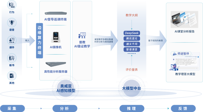 系統(tǒng)結(jié)合課堂教學(xué)多模態(tài)數(shù)據(jù),結(jié)合大模型技術(shù),形成課堂質(zhì)量數(shù)據(jù)分析報(bào)告,輔助實(shí)現(xiàn)課堂教學(xué)多模態(tài)評(píng)價(jià)、智能督導(dǎo),為確立“教、學(xué)、評(píng)”一體化智能評(píng)價(jià)新范式提供觀測(cè)手段與依據(jù);在此基礎(chǔ)上,AI師途智伴進(jìn)一步將抽象的課堂數(shù)據(jù)轉(zhuǎn)化為可落地的策略建議,幫助教師基于具體教學(xué)情境,開(kāi)展個(gè)性化的教學(xué)探索,加快形成“師-機(jī)-生”復(fù)合的教學(xué)深度應(yīng)用。