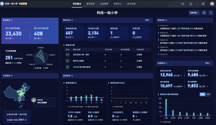 而在希沃魔方賦能下所搭建的教研數字化平臺,2.3萬余份云課件教案、1萬余份校本資源、400多次校本研修活動形成龐大的“校本資源數字資產庫”,不斷滿足教師們的教學需求。研修活動產生的一份份客觀數據成為教師專業成長的“刻度尺”,數據客觀呈現,助力學校精準把握教學動態,為教學決策提供有力支撐。