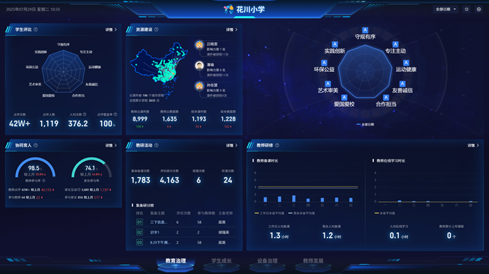 學(xué)校以希沃AI為引擎,同時(shí)通過希沃魔方·數(shù)字基座搭建四大平臺(tái),全面整合教研管理、學(xué)生成長、教師發(fā)展、設(shè)備管理等多維度數(shù)據(jù),打破數(shù)據(jù)孤島,實(shí)現(xiàn)數(shù)據(jù)互通與閉環(huán)管理。全鏈條智慧生態(tài)治理模型的建構(gòu),為管理者提供精準(zhǔn)、高效的數(shù)據(jù)支持,使花川小學(xué)實(shí)現(xiàn)了教師專業(yè)發(fā)展的全流程管理。