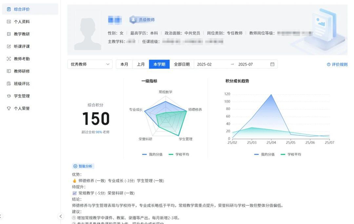 數(shù)字基座平臺(tái)無感采集教師在AI集備、聽評課以及課堂教學(xué)中的數(shù)據(jù),并從師德修養(yǎng)、專業(yè)成長、教學(xué)常規(guī)和學(xué)生管理五個(gè)維度構(gòu)建教師發(fā)展畫像。教師可以借助雷達(dá)圖對標(biāo)成長模型,獲取個(gè)性化建議,從而為專業(yè)發(fā)展提供科學(xué)指引。教學(xué)管理者則通過電子檔案袋和多維數(shù)據(jù)分析,實(shí)現(xiàn)精準(zhǔn)管理,同時(shí)為評優(yōu)評職和管理策略調(diào)整提供客觀依據(jù)。