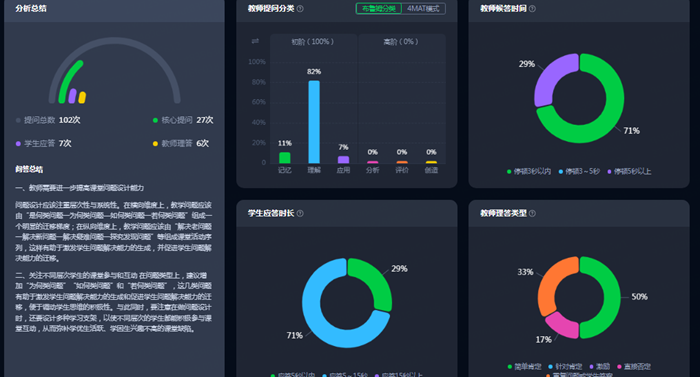 針對師生發展需求與教研實踐中的實際困境,龍游縣塔石小學引入希沃AI課堂智能反饋系統,該系統可對課堂進行三維數據分析,依托專業教學模型實施量化評估,借助AI技術生成針對性反饋建議,并最終形成AI分析報告,為課堂教學改進提供數據支撐與優化路徑。