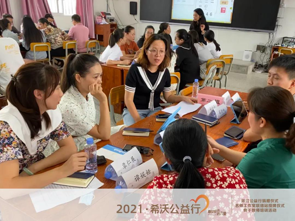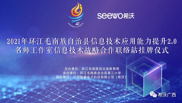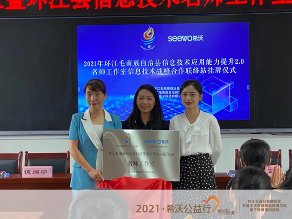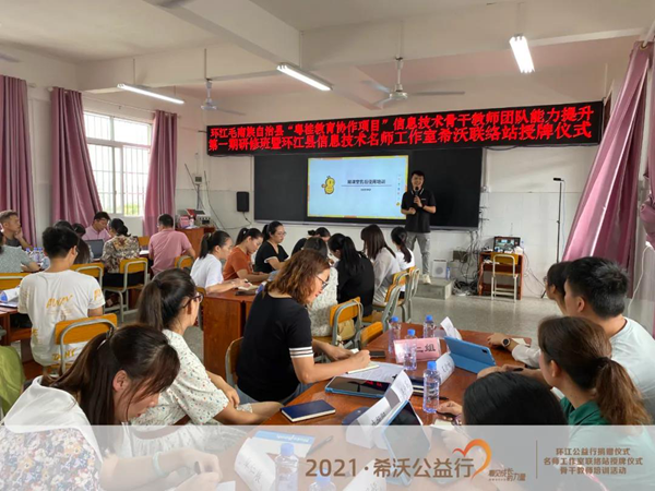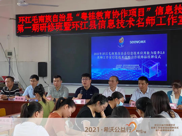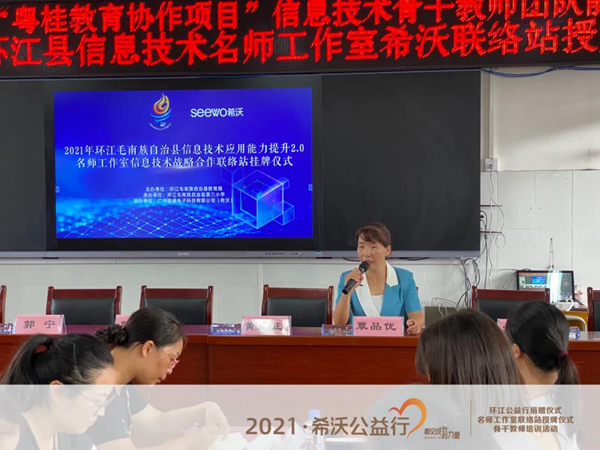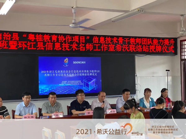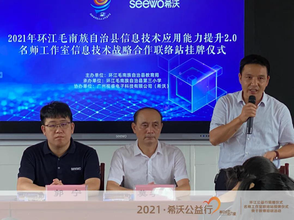 2021年8月19日,希沃在環(huán)江毛南族自治縣第三小學(xué)舉行了希沃公益行設(shè)備捐贈(zèng)儀式。同時(shí),希沃?jǐn)y手環(huán)江毛南族自治縣教育局,共同助力環(huán)江縣名師工作室骨干教師成員開(kāi)展了為期兩天的“粵桂教育協(xié)作項(xiàng)目”研修班活動(dòng),讓骨干教師團(tuán)隊(duì)就創(chuàng)造更多樣化教學(xué)模式展開(kāi)了深度的研修和探討。環(huán)江毛南族自治縣教育局莫李全委員、電教站黃廣正站長(zhǎng)、譚炤宇副站長(zhǎng)、師培中心覃品優(yōu)老師、林文強(qiáng)老師、環(huán)江三小校長(zhǎng)羅懿校長(zhǎng)、希沃廣西區(qū)域總經(jīng)理郭寧等領(lǐng)導(dǎo)受邀出席了本次活動(dòng),并與教師們共同見(jiàn)證了環(huán)江毛南族自治縣信息技術(shù)名師工作室希沃聯(lián)絡(luò)站授牌儀式。