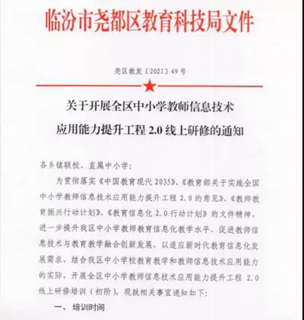 為貫徹落實教育部《關于實施全國中小學教師信息技術應用能力提升工程2.0的意見》的工作要求,并響應教育部《關于在疫情防控期間有針對性地做好教師工作若干事項的通知》統一部署,臨汾市堯都區教育局基于本區域的現狀,積極探索教師線上培訓研修模式,通過組織開展“堯都區中小學教師信息技術應用能力提升工程2.0線上研修活動”,來提升區域內中小學教師教育信息化教學水平,促進教師信息技術與教育教學相融合的創新發展。