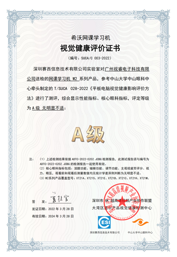 4月13日上市的希沃網(wǎng)課學習機W2,依據(jù)中山大學中山眼科中心牽頭制定的T/SUCA 028-2022《平板電腦視覺健康影響評價方法》,經(jīng)過深圳賽西信息技術有限公司實驗室測評,獲得視覺健康影響A級評定,標志希沃網(wǎng)課學習機W2在觀看舒適度上達到了“高標準”的視覺體驗。