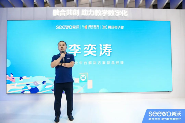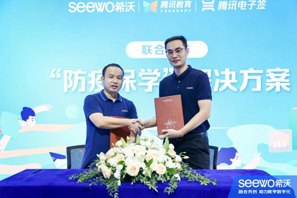 展會(huì)現(xiàn)場(chǎng),希沃與騰訊電子簽簽署項(xiàng)目合作協(xié)議。騰訊云企業(yè)中臺(tái)解決方案副總經(jīng)理李奕濤、廣州視睿電子科技有限公司(希沃)