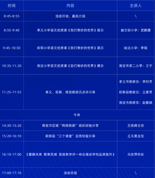 本次交流活動以“大單元教學”為主題,通過“同課異構”觀摩課、課例研討、新課改及三個課堂建設經驗交流等環節,謀求學校教育教學改革的共識,提高教育教學質量,促進區域教育均衡。