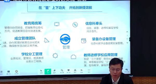 前郭縣王天昊主任從區域情況、方案設計、建管培用、取得成績四個方面介紹了前郭縣三個課堂的建設情況,指出“三個課堂”實現常態化應用一方面需要城鄉一體化的硬件建設,還需要在教師培訓上多下功夫,同時要明確各部門職責分工并制定考核評價體系。