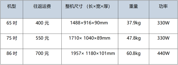 ☞交互智能平板設(shè)備單臺(tái)往返運(yùn)費(fèi)及設(shè)備規(guī)格(加壁掛厚度增加30mm)如下: