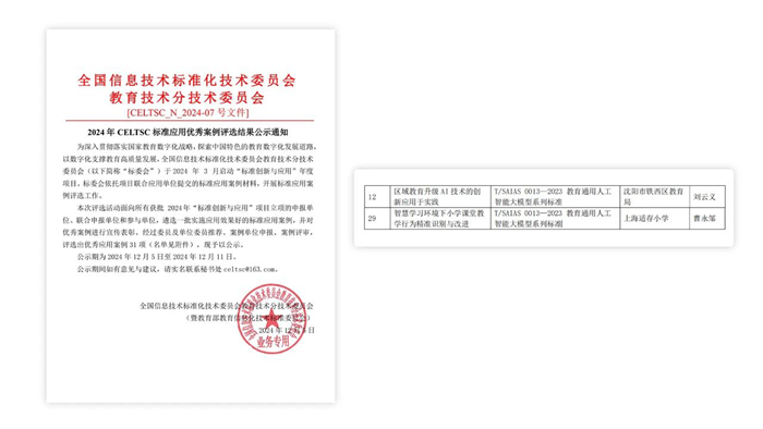 近日,全國(guó)信息技術(shù)標(biāo)準(zhǔn)化技術(shù)委員會(huì)教育技術(shù)分技術(shù)委員會(huì)暨教育部教育信息化技術(shù)標(biāo)準(zhǔn)委員會(huì)(以下簡(jiǎn)稱(chēng)“標(biāo)委會(huì)”)于海南省三亞市召開(kāi)了“2024下半年全體會(huì)議暨教育信息化技術(shù)標(biāo)準(zhǔn)研討會(huì)”,公布了2024年CELTSC標(biāo)準(zhǔn)應(yīng)用優(yōu)秀案例評(píng)選結(jié)果。由廣州視睿電子科技有限公司(希沃)技術(shù)支持的兩個(gè)案例入選,分別是沈陽(yáng)市鐵西區(qū)教育局的《區(qū)域教育升級(jí)AI技術(shù)的創(chuàng)新應(yīng)用于實(shí)踐》、上海市長(zhǎng)寧區(qū)適存小學(xué)的《智慧學(xué)習(xí)環(huán)境下小學(xué)課堂教學(xué)行為精準(zhǔn)識(shí)別與改進(jìn)》。