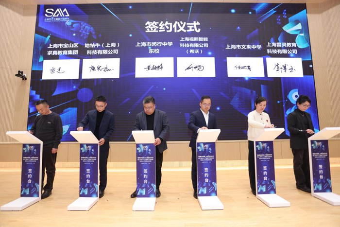 會上,12家人工智能企業與教育場景單位達成供需簽約,其中上海視熙智能科技有限公司作為人工智能企業與教育場景單位上海市閔行中學東校達成供需簽約。