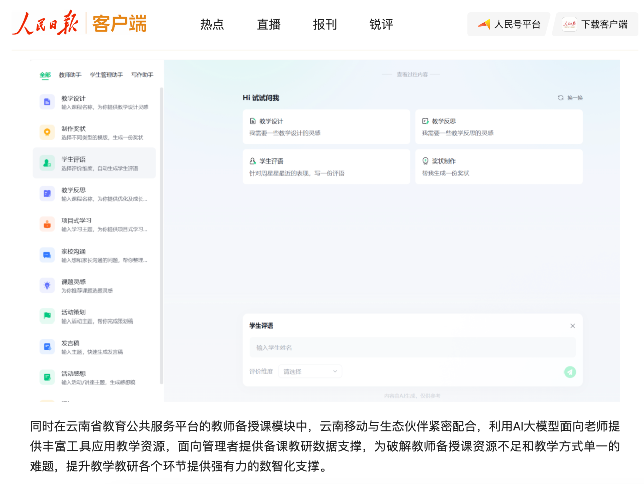 3月4日,人民日報客戶端發布報道,關注云南省教育廳教育公共服務平臺2.0版正式上線。報道提及:“基于中國移動云南公司定制部署的DeepSeek大模型智能體同步開放服務,標志著云南省教育公共服務平臺在利用AI技術開展教育數字化服務上邁出了重要一步�!�