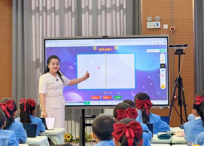 課例一:《軸對稱》(執(zhí)教者:銀川市金鳳區(qū)第十一小學(xué)-姚佳):以傳統(tǒng)文化剪紙為切入點,借助DeepSeek工具開發(fā)的“對稱點獵人”動態(tài)交互程序,引導(dǎo)學(xué)生直觀探究并驗證“對稱點到對稱軸距離相等”及“對稱點連線垂直于對稱軸”的核心性質(zhì),借助希沃智慧課堂學(xué)生終端的AI圖像創(chuàng)作功能,加強學(xué)生對知識的理解,做到學(xué)以致用。有效化解傳統(tǒng)教學(xué)中空間想象的抽象難點。