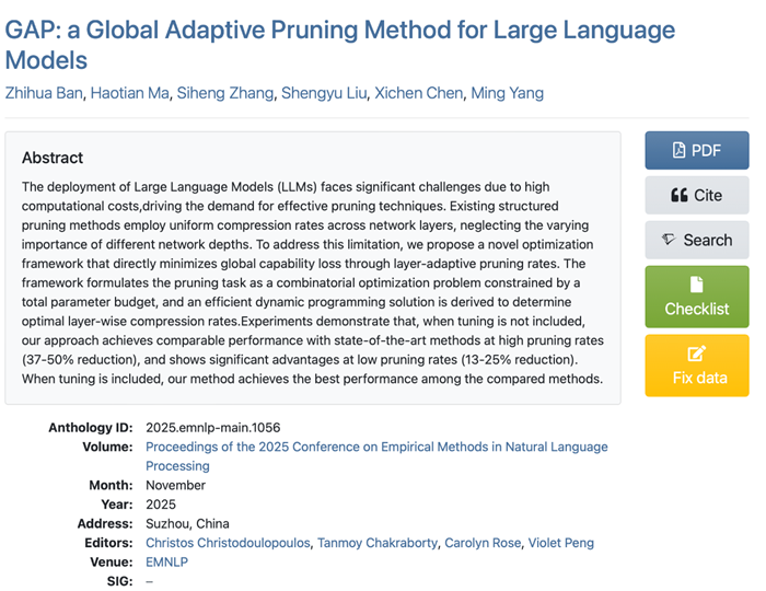 11月4日至9日,自然語言處理領(lǐng)域三大頂級國際會議EMNLP(ConferenceonEmpiricalMethodsinNaturalLanguageProcessing)在蘇州舉行。希沃母公司——視源股份人工智能團(tuán)隊(duì)在大會上取得突破性成果——由視源AI團(tuán)隊(duì)主導(dǎo)的“模型剪枝”技術(shù)論文被大會主論壇接收。本次會議投稿量達(dá)8174篇,主會接受率僅為22.16%,該成果的入選標(biāo)志著視源股份在算法端側(cè)化領(lǐng)域的技術(shù)實(shí)力獲得國際學(xué)術(shù)界權(quán)威認(rèn)可。