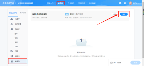 那么其他教師該如何接收呢?接收的布置也是非常的簡單方便,登錄教師空間后,打開云空間,找到備課包一欄,點擊“接收”就可以了。這是不是比在群里爬樓下載文件快多了~~接收后可以進行查看和預覽、直接布置、加入資源包再編輯,也可以再次分享。