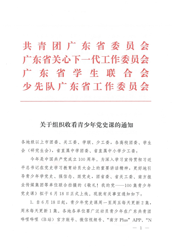 6月16日,共青團廣東省委員會、廣東省關心下一代工作委員會、廣東省學生聯合會、少先隊廣東省工作委員會聯合發布《關于組織收看青少年黨史課的通知》,希望各地單位充分運用優質黨史微課資源,通過自學、集中學等形式積極開展青少年交流實踐活動。