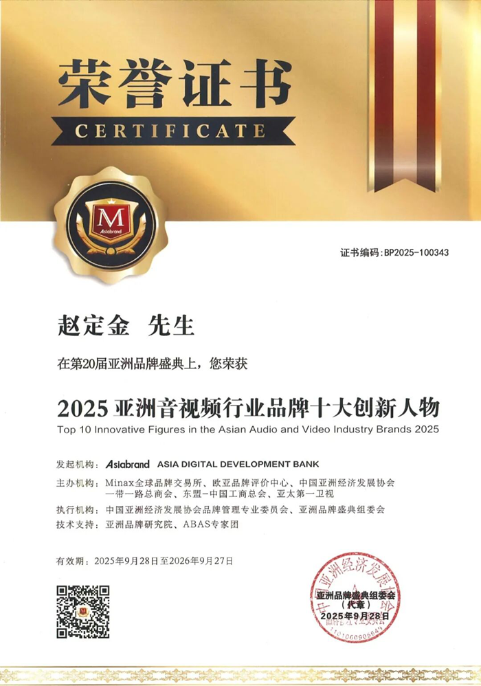 多年來,趙定金在音視頻領域展現出不懈的奮斗精神與創新成果,贏得了社會各界的廣泛贊譽。他先后獲得了“2024年度智能制造影響力人物”“廣東民營企業家智庫成員”“廣州市電子音響行業領軍人物”“杰出產業人才一等獎”以及“中國(行業)十大創新人物”等多項殊榮。此次榮獲“亞洲音視頻行業品牌十大創新人物”稱號,既是對趙定金總裁取得非凡成就的再次肯定,也是itc創新發展的無限動力。