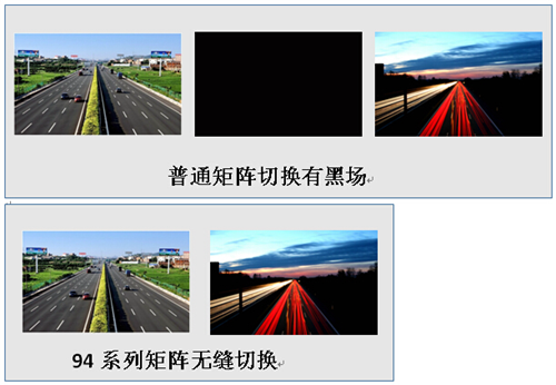 一般矩陣在將信號輸出到顯示屏上時,會出現(xiàn)黑場、藍屏等中間過渡狀態(tài),而TS-94系列矩陣可支持信號間的無縫切換,尤其適用于切換效果要求高的場合。