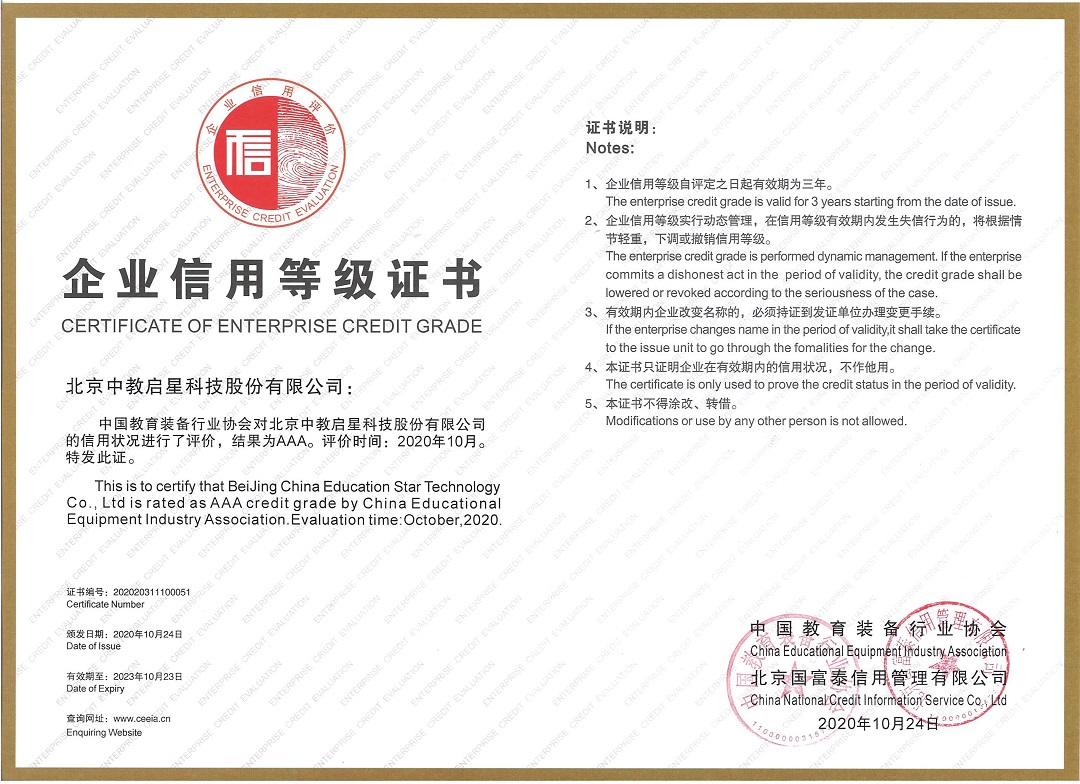 北京中教啟星科技股份有限公司作為最早獲得中國教育裝備行業協會AAA企業信用等級證書的教育裝備企業,再次通過2020年教育裝備企業信用等級嚴格評審,獲得2020年中國教育裝備行業AAA企業信用等級證書。