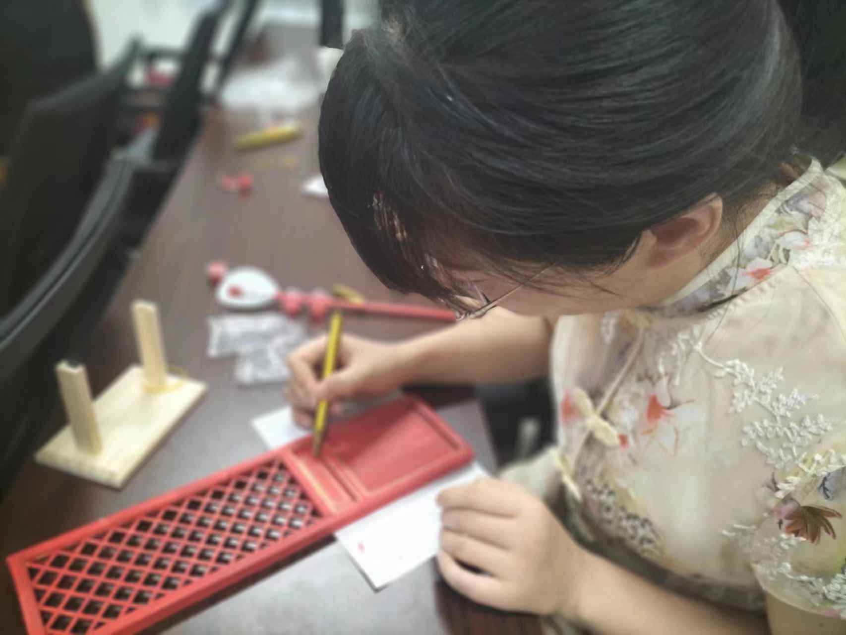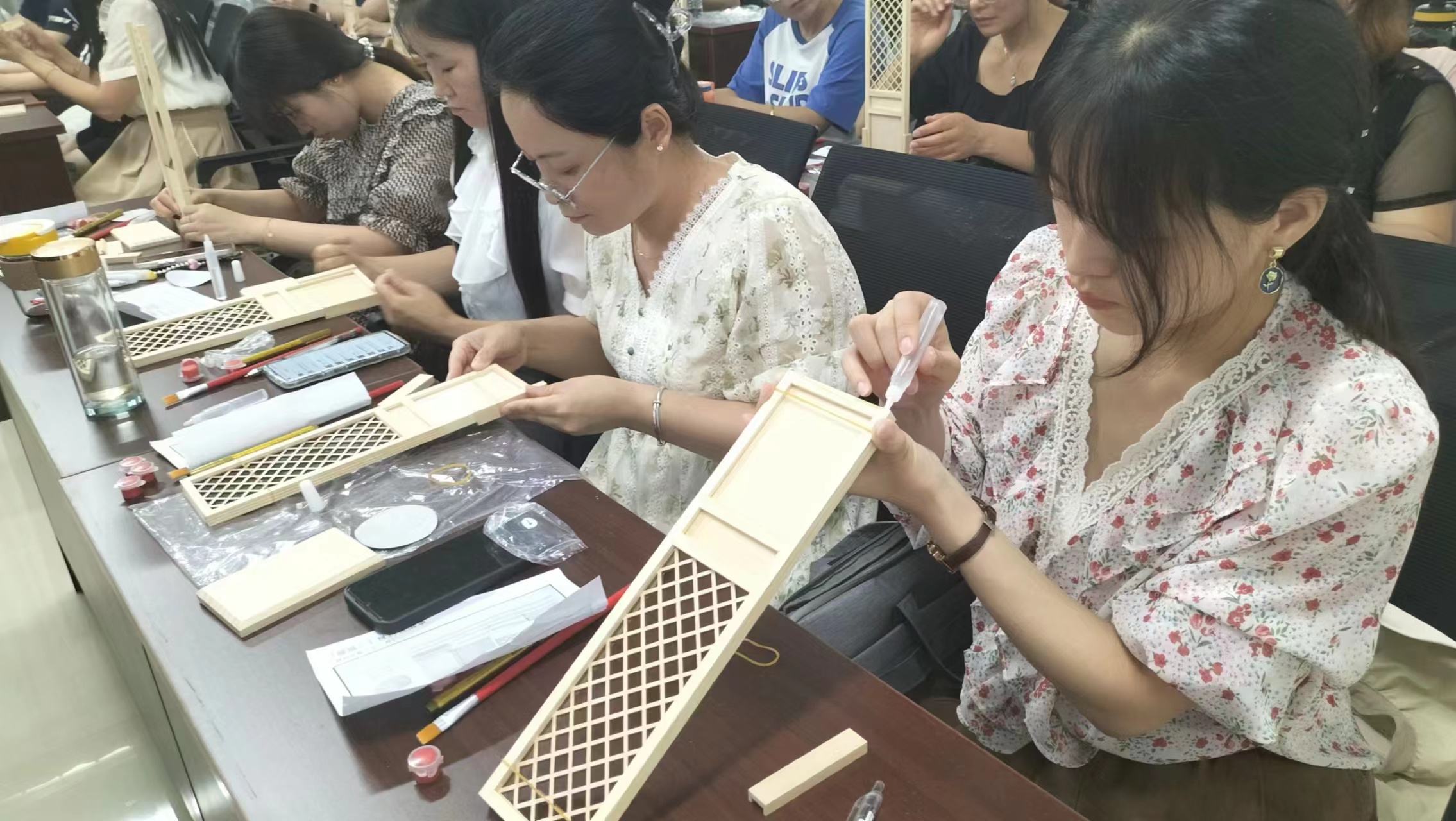 了解政策和實踐案例之后,教師們體驗了一節實操課程——木作文化課程。在這個課程上,每位教師們都親手制作了一扇美麗的隔扇,并學習隔扇背后的文化內涵。這不僅讓教師們深入了解傳統文化,也讓他們在創作中體驗到了木作魅力。