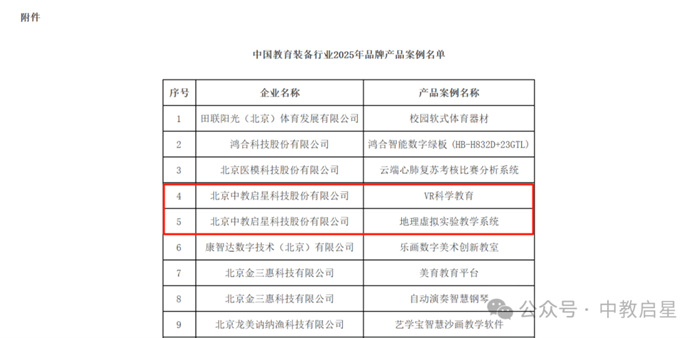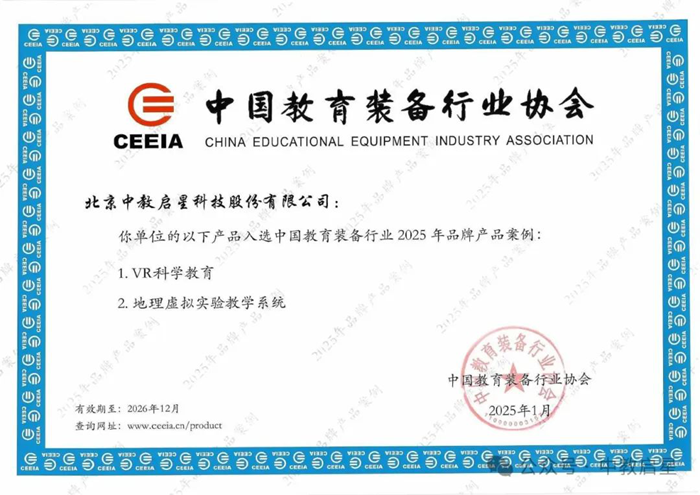 為培育一批具有較強競爭力的優秀產品,進一步提升教育裝備產品質量,中國教育裝備行業協會于2024年3月啟動了2025年品牌產品案例征集活動,得到了廣大會員單位的積極反饋。中教啟星響應號召積極參與活動,經過網上填報、材料提交、屬地審核、資格審查、專家審查、第84屆中國教育裝備展示會現場審查評議和公示等程序,VR科學教育、地理虛擬實驗教學系統兩個產品從數千產品中脫穎而出,入選中國教育裝備行業2025年品牌產品案例名單。與此同時,中教啟星教育裝備產品連續多年獲得中國教育裝備行業協會優秀產品推薦。