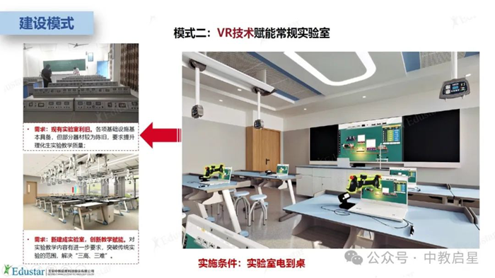 該模式面向原有實驗室陳舊,面臨功能升級需求場景,通過引入VR技術,補充和提升傳統理化生實驗室的信息化水平,使傳統實驗室具備更先進的實驗演示和互動功能,增強學生的實驗體驗和學習效果。