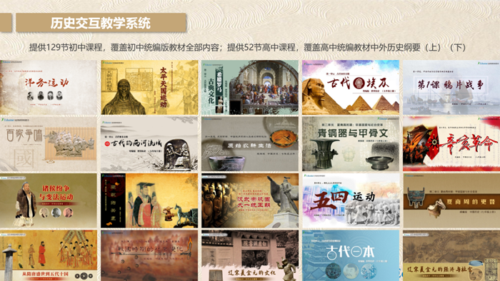 歷史專用教室聚焦中學歷史教材單元學習內容,并以此為教育資源展示案例,將現代教育技術教學成果貫穿歷史教學全過程,使新技術與歷史教學過程進行深度融合。
