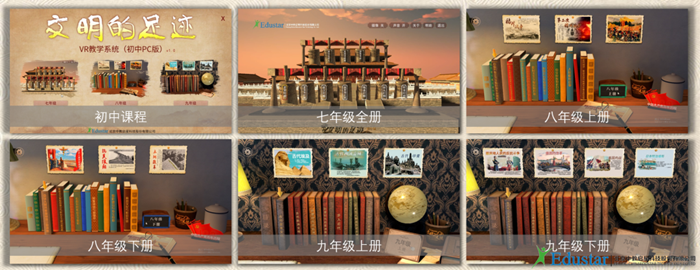 文明的足跡VR教學系統滿足中學歷史課程標準要求,涵蓋統編初中七、八、九年級、高中《中外歷史綱要》上下冊歷史教科書內容,軟件對3D歷史地圖、3D歷史場景、知識結構、時間軸、實物史料、文獻史料、圖像史料、歷史解釋等歷史教學素材和資源進行了系統整合。軟件內含初中七、八、九年級120節課程的教學場景,高中歷史52個課程專題。
