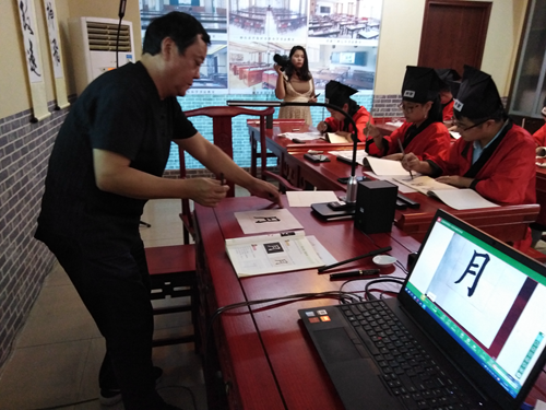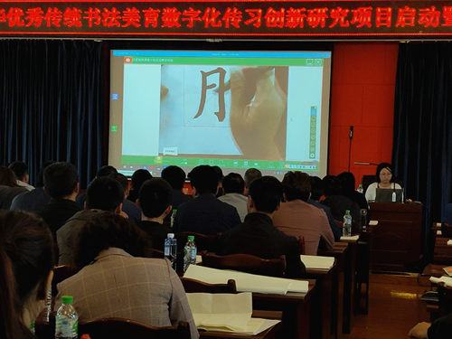 在武老師專業的書法示范教學和講解下,主課堂的學生與分會場的老師一同書寫。分會場的老師通過未來遠程書法系統,可清晰地觀看武老師和學生書寫的全過程。