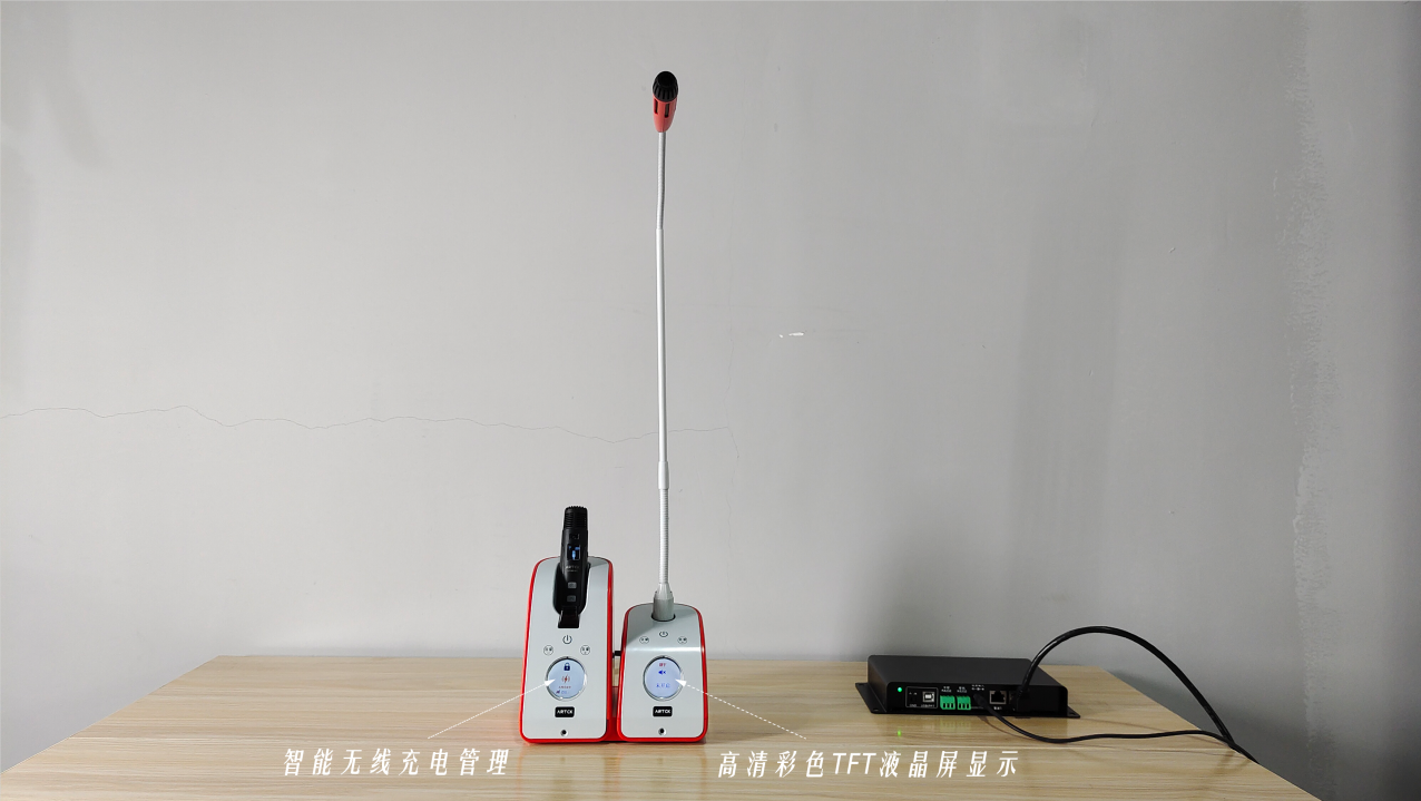使用者可以通過觸摸式感應按鍵指令或者中控指令輕松完成無線話筒取出/歸還的動作。無線話筒取出之后自動解鎖連接使用,確保無線話筒的使用過程流暢,使用者體驗感極佳。觸摸管家面板上的按鍵可控制話筒音量的大小,靈動悅耳的語音提示也隨之響起,此外還有高清TFT彩屏顯示音量狀態、話筒信道等信息。