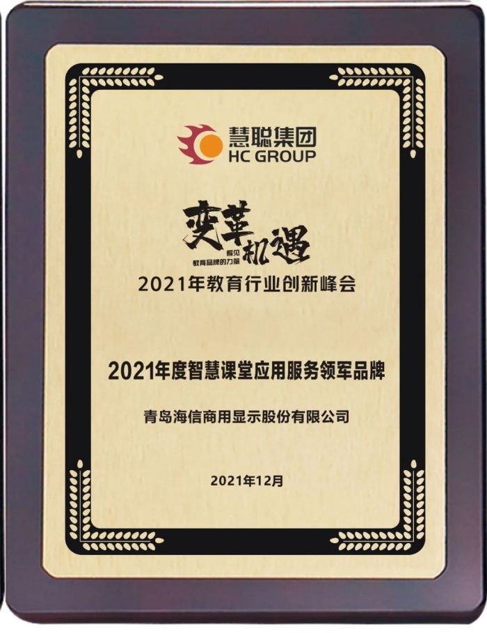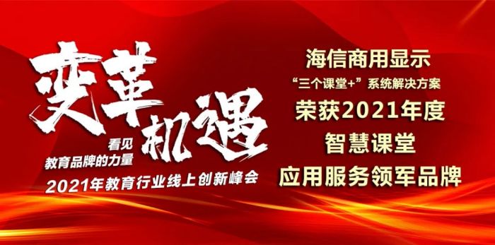 今天下午,由慧聰教育網主辦的2021年教育行業線上創新峰會盛大舉行。此次創新峰會,以用戶為主線,以場景為導航,以政策為引導,甄選出新教育生態下的品牌,由此誕生了2021年教育行業創新品牌榜單。榜單涵蓋了智慧教育應用、行業品牌創新、健康校園應用以及科技賦能教育四大版塊,海信商用顯示公司“三個課堂+”系統解決方案榮獲2021年度智慧課堂應用服務領軍品牌獎。