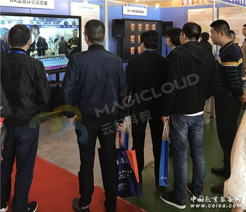 展位現場人頭攢動,3D與AR的展示吸引了眾多人員前來參觀體驗。AR+教育是一種創新的教學形式,云幻科教AR物理仿真實驗室綜合應用AI和AR技術,通過3D建模虛擬再現真實的實驗場景,借助先進的體感交互設備Kinect識別操作者的手勢,與畫面中虛擬的實驗器材進行互動。