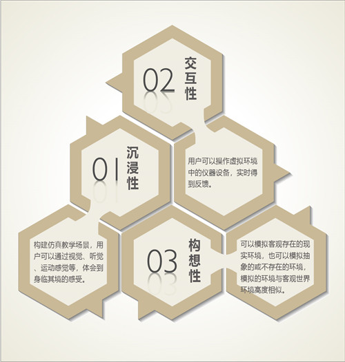 第一個是其沉浸性,構建仿真教學場景,用戶可以通過視覺、聽覺、運動感覺等,體會到身臨其境的感受;第二個是交互性,用戶可以操作虛擬環境中的儀器設備,實時得到反饋;第三個是構想性,虛擬仿真技術可以模擬客觀存在的現實環境,也可以模擬抽象的或不存在的環境,模擬的環境與客觀世界環境高度相似。