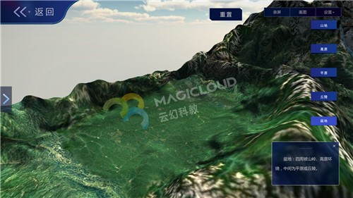 云幻科教VR地理仿真實驗資源制作等高線的地形模型,使用不同顏色標注不同海拔的等高線,便于學生理解等高線地形圖的繪制原理,通過不同的地形模型,引導學生認識各種地表形態的名稱、特點,輕松學習地理知識。