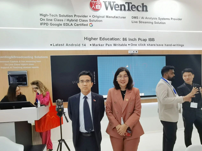 展會(huì)期間,中國(guó)駐阿聯(lián)酋大使館教育參贊樊釘親臨WenTech展位參觀。樊釘參贊對(duì)WenTech展出的產(chǎn)品和技術(shù)表示了濃厚的興趣,對(duì)WenTech在教育科技領(lǐng)域的創(chuàng)新實(shí)力給予了高度評(píng)價(jià)。樊釘參贊表示,中國(guó)企業(yè)在教育科技領(lǐng)域的創(chuàng)新和發(fā)展對(duì)于推動(dòng)中阿教育合作具有重要意義,希望WenTech能夠繼續(xù)加強(qiáng)技術(shù)創(chuàng)新和產(chǎn)品研發(fā),為中阿教育合作貢獻(xiàn)更多力量。