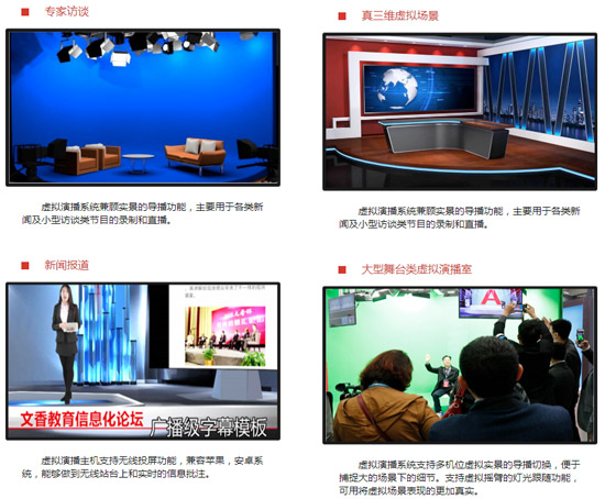 北京文香一體化虛擬演錄播系統集成真三維虛擬場景、智能摳像、遠程視頻連線、燈光效果、實時字幕、錄播、虛擬機位、虛擬屏幕添加、虛擬搖臂、熱點識別等多種功能,可以滿足不同用戶需求。