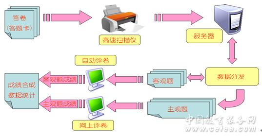 產品詳細介紹網上閱卷又稱網絡閱卷、計算機閱卷或無紙化閱卷。它是基于計算機網絡環境,運用圖片掃描、模式識別、圖像處理等技術對考試答題卡進行電子化處理的過程。此閱卷方式將客觀題與主觀題都在一張答題卡上作答,通過高速文檔掃描儀掃描存儲到計算機內,得到清晰準確的圖像文件后,客觀題由計算機自動閱卷,主觀題無需再翻卷批閱,而是由老師通過計算機進行閱卷,閱卷完畢后由計算機自動匯總分數,并可隨機生成幾十種成績分析統計報表。網上閱卷方式公平公正、方便快捷,大大提高工作效率,降低教師的工作強度,對減少和有效控制評卷誤差、監控評卷質量起到了積極作用,使考試管理工作實現了真正意義上的全面信息化、自動化、網絡化。