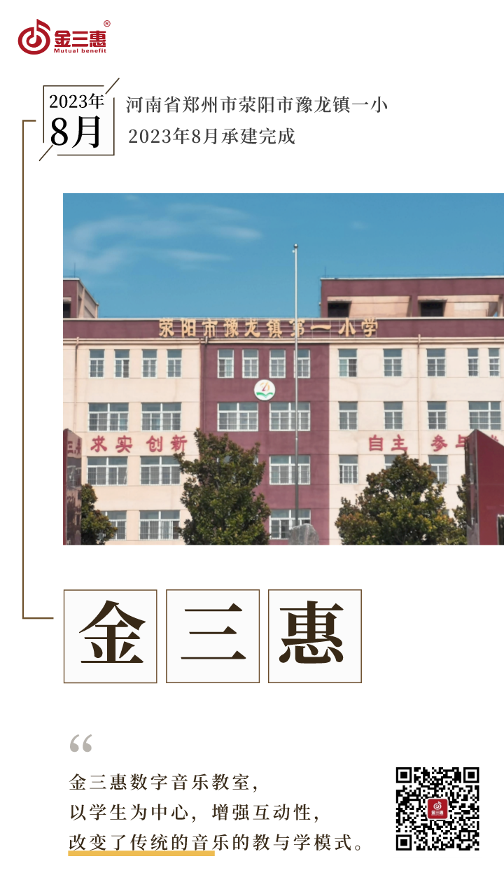 2023年8月,金三惠數字音樂教室為河南省鄭州市滎陽市豫龍鎮第一小學提供、安裝、培訓的12+1智慧創客音樂教室正式開始使用!配備了金三惠教學系統、電鋼琴、數字音樂教學儀等教學教具。