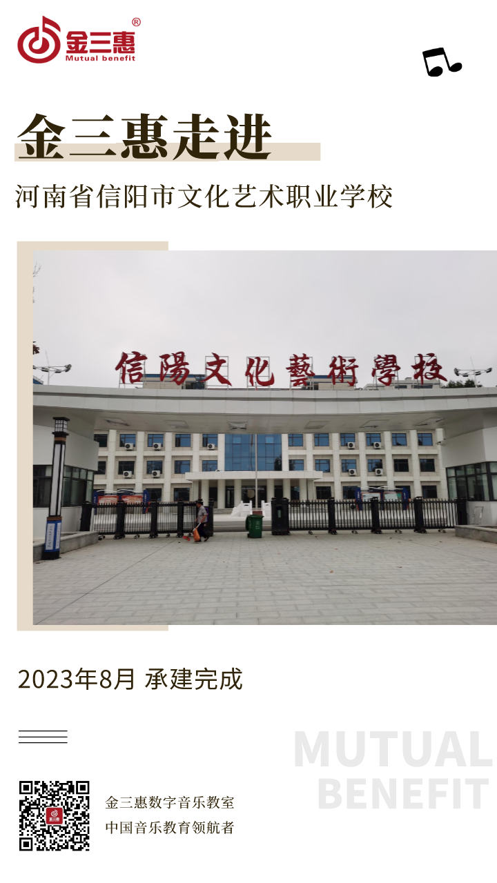 2023年8月,金三惠數字音樂教室走進河南省信陽市文化藝術職業學校,為學生提供了26+1的電鋼琴教室,配備了金三惠電鋼琴教學系統、電鋼琴、數字音樂教學儀等教學教具等。