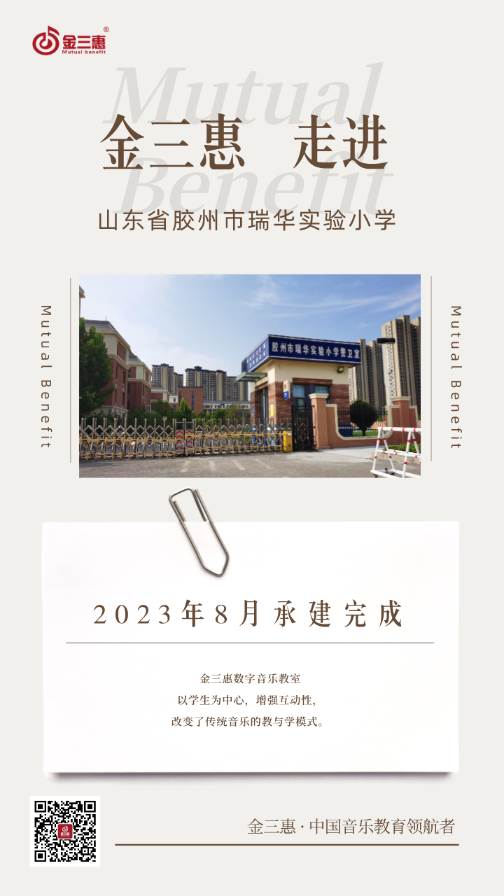 2023年8月,金三惠數(shù)字音樂教室走進山東省膠州市瑞華實驗小學,為學生提供了24+1的電鋼琴教室,配備了金三惠電鋼琴教學系統(tǒng)、電鋼琴、數(shù)字音樂教學儀等教學教具等。