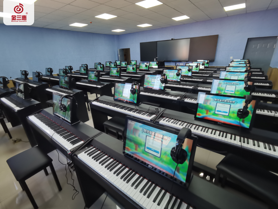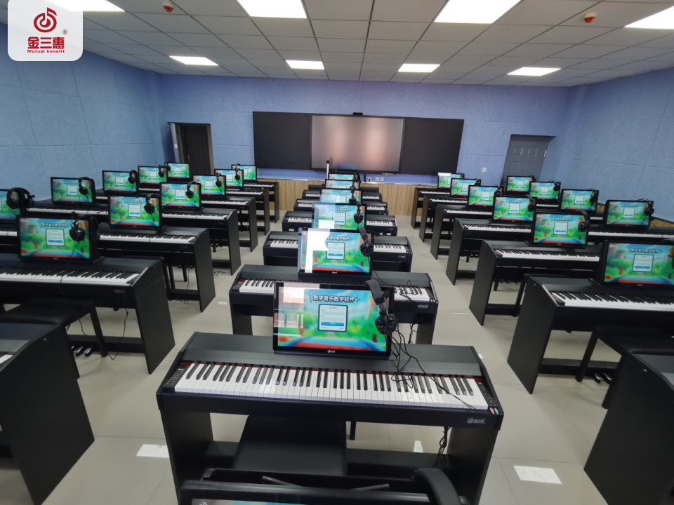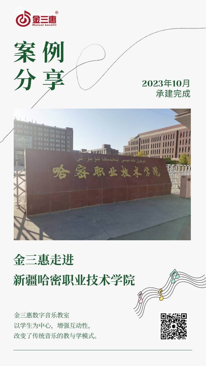 2023年9月,金三惠數字音樂教室為新疆哈密職業技術學院提供、安裝、培訓的40+1智慧創客音樂教室正式開始使用!配備了金三惠教學系統、電鋼琴、數字音樂教學儀等教學教具。